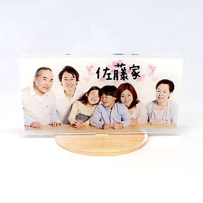 横17×縦15cmのアクリル板に最大7×14cmのアクリルフィギュアが作成できます。台座やフレームもデザイン自由!