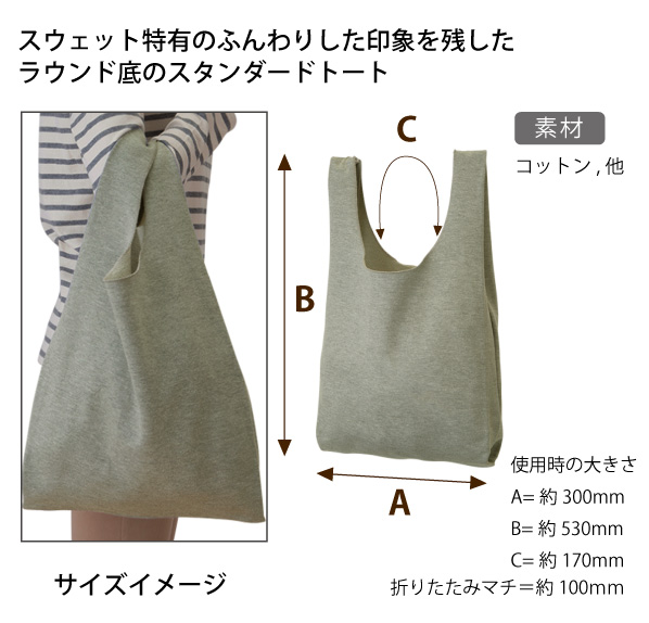 スウェット生地なので、重量のあるお荷物を入れると生地が伸びてしまう可能性がございます。ご注意ください。