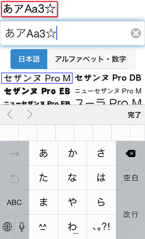 「テキスト入力」枠の上に、入力した文字を選択したフォントにした場合のプレビューが表示されますので、どんな見た目になるか確認しながらフォントを選べます。