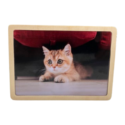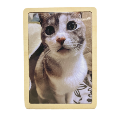 美しいラメ感のあるアルミプレートに印刷された、木製フレームのフォトスタンド。